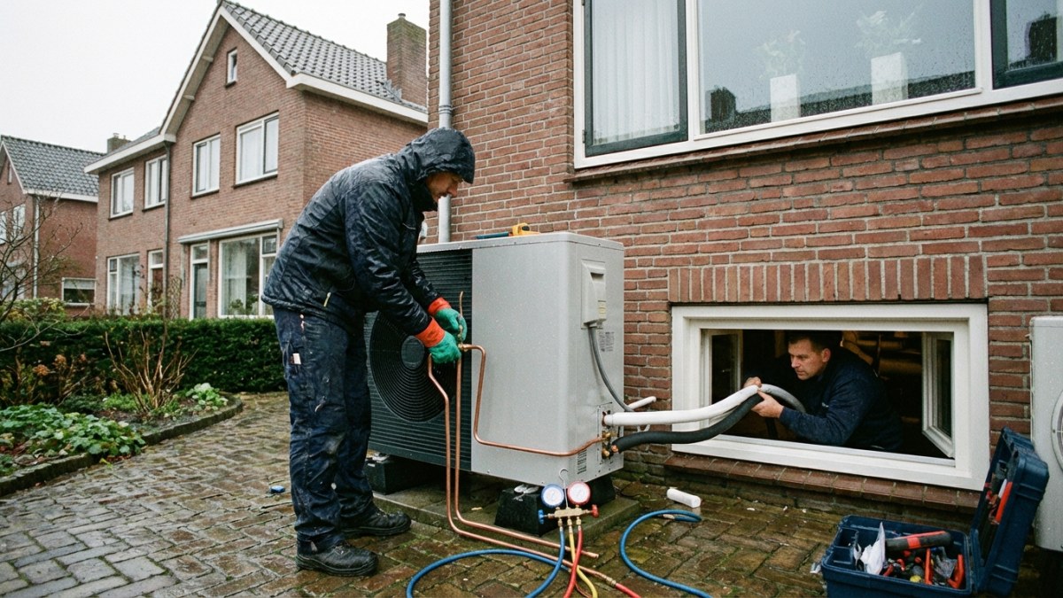 De monteurs plaatsen de buitenunit op een fundering of muurbeugel. Ze leggen de leidingen naar binnen (split) of de waterleidingen (monoblock).